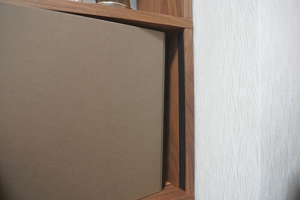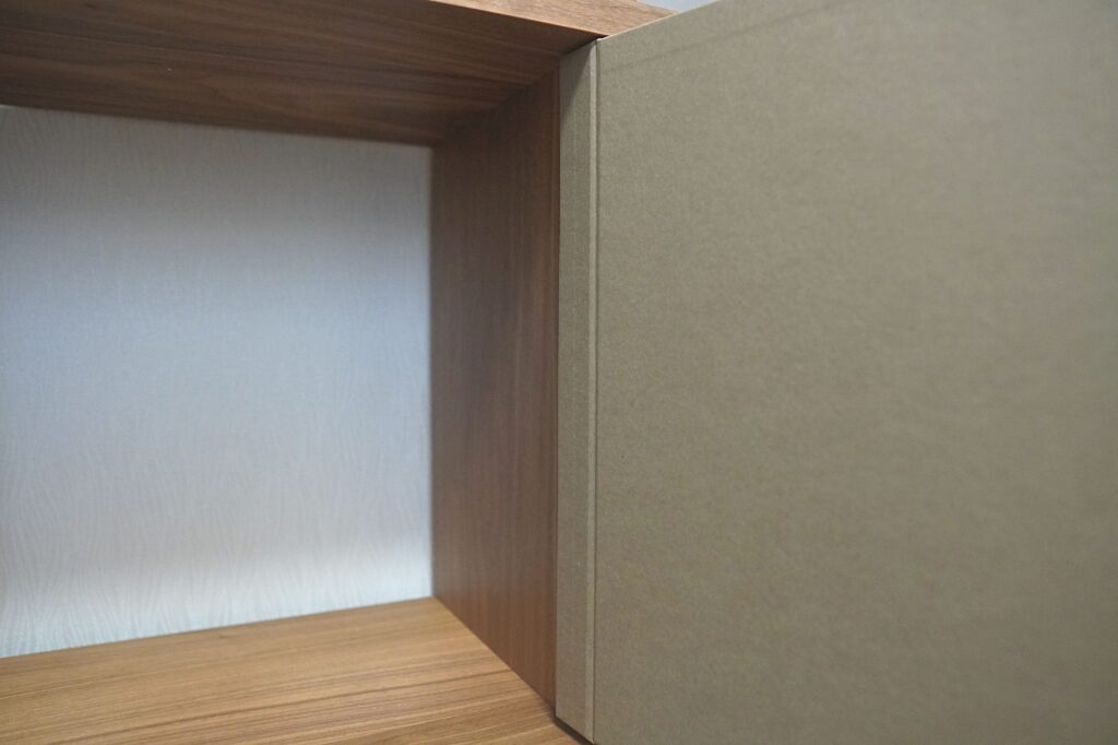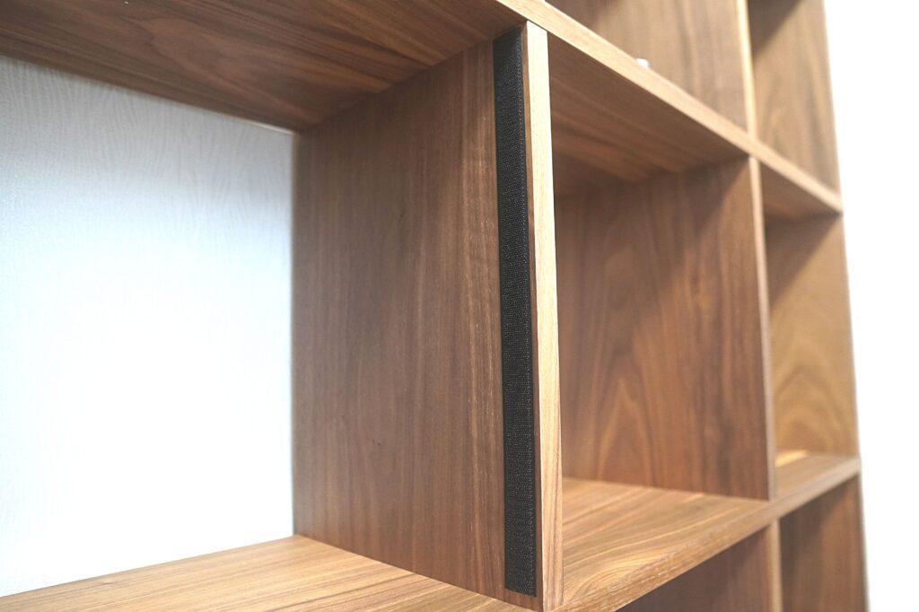 フラップ扉の取り付けは、マジックテープを棚に貼り付けるだけで完了。とても簡単です。